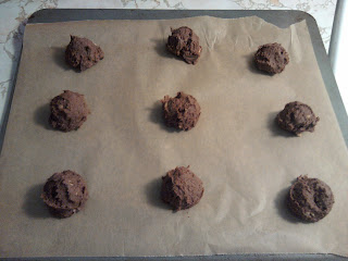 I read over the recipe and it seemed easy enough - all I needed was a bag of mini peanut butter cups. I changed a couple of things up in the recipe and was ready to get going with it. Make sure that when you add in the peanut butter cups to stir them in by hand. If you do it with a mixer, a lot of them get broken. Clearly, I used the mixer - they came out just fine - a little crushed here and there. But if that doesn't matter to you then the mixer works just fine. These don't expand a lot during the baking time, so if you want to try to squeeze more on a sheet at a time you can. Scoop out the dough........